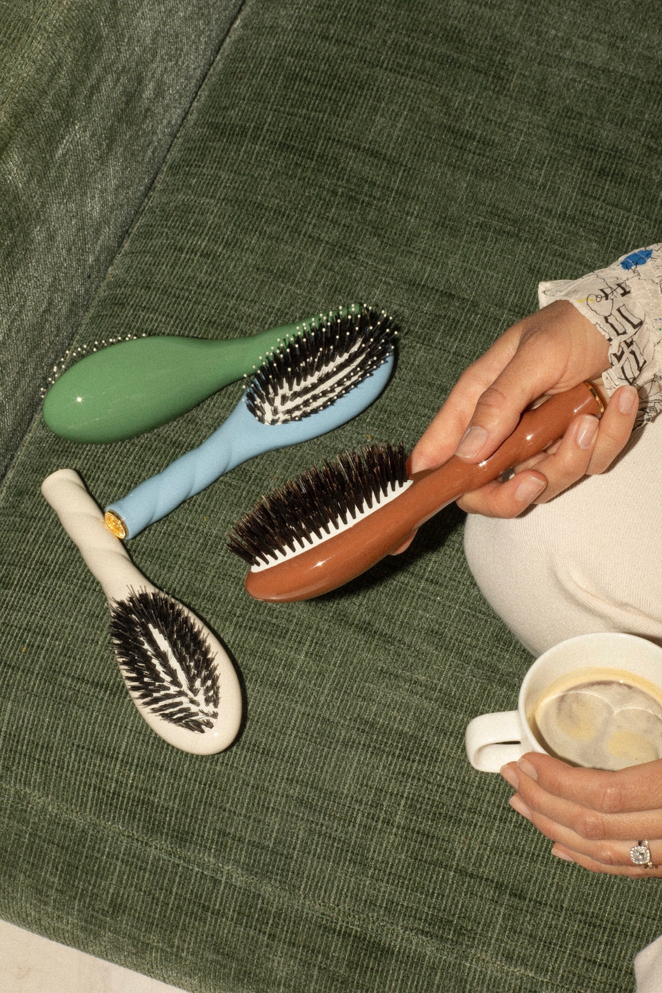 Unsere Wildschweinborstenbürstenmodelle L'universelle , L'indispensable und L'indispensable douceur , mit oder ohne Nylon, sind besonders effektiv bei der Talgverteilung.